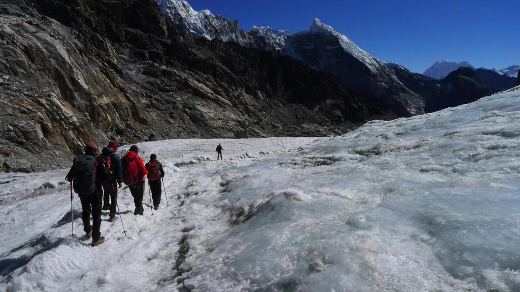 Después entramos en el glaciar que está muy descompuesto, pero a veces hay hielo cristal y hay que tener cuidado de no pisarlo. Pisamos siempre por las zonas donde el hielo tiene mucha piedrilla o donde su superficie está quebrada y no resbala. Según Carlos, cuando pasó la vez anterior que estuvo aquí, el glaciar estaba cubierto de nieve y se bajaba estupendamente.