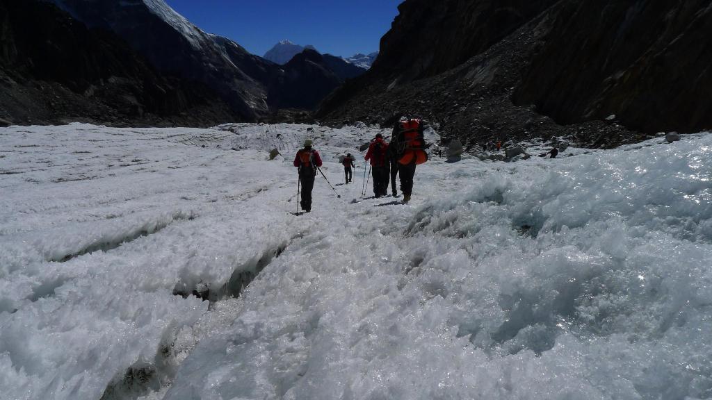 Nos vamos metiendo hacia la morrena lateral a nuestra derecha para salir de la lengua principal. Llegamos al imponente frente del glaciar (fin del glaciar 5250m 5h24′) y, un poco más adelante, hay una cómoda plataforma donde paramos a comer. Los guías han traído huevos cocidos, galletas y bizcocho con chocolate y mis compañeros sacan cecina y queso traído de España, un festín. Rondan las chovas, las cornejas y algún acentor, y un perro que ha venido desde Dragnag.