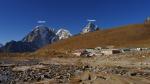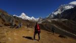 Salimos de Dzonglha (4820m) para hacer una ruta bastante suave. Seguimos descendiendo el valle del Chola. Abajo a la derecha el lago Cholatse Tsho y sobre él la inmensa pared del pico Cholatse (6440m). El Ama Dablan aparece al fondo. Según vamos bajando la vista se abre y a la derecha del Ama Dablan aparece el Khantega.