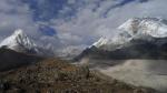 Desde Lobuche (4920m) el camino se dirige a Gorak Shep subiendo el valle del Khumbu, con el glaciar a nuestra derecha. Es un camino con muy poco desnivel, todo el tiempo por la morrena lateral por lo que hay bastantes zonas pedregosas y bastante subeybaja. Está muy transitado, mucha gente en ambos sentidos, a veces se forman auténticos atascos, sobre todo cuando pasa una recua de yaks. También hay movimiento constante de helicópteros.