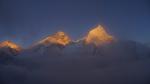 El Kalaphatar es en realidad un cota en una prolongación del Pumori, preciosa montaña que tenemos todo el rato delante. La tarde está muy despejada, las nieblas quedan por debajo. Según vamos subiendo la vista a nuestra derecha se va abriendo y es espectacular. El Everest y el Nupse aparecen gigantescos, inmensos glaciares y seracs bajan del Nupse y, con las luces del atardecer, van dando volumen y perspectiva.