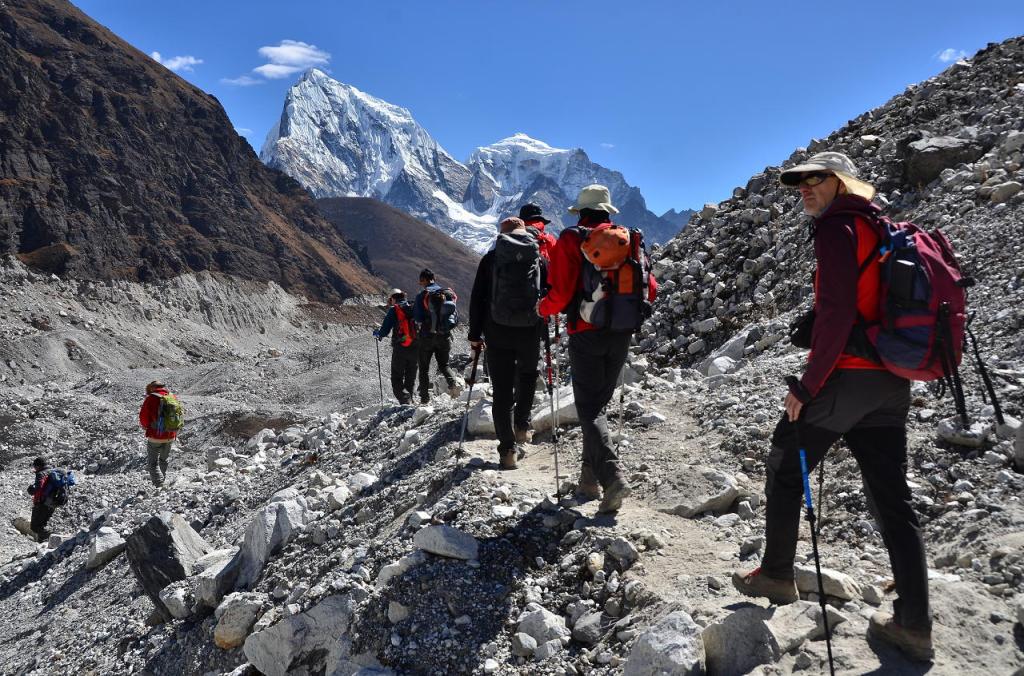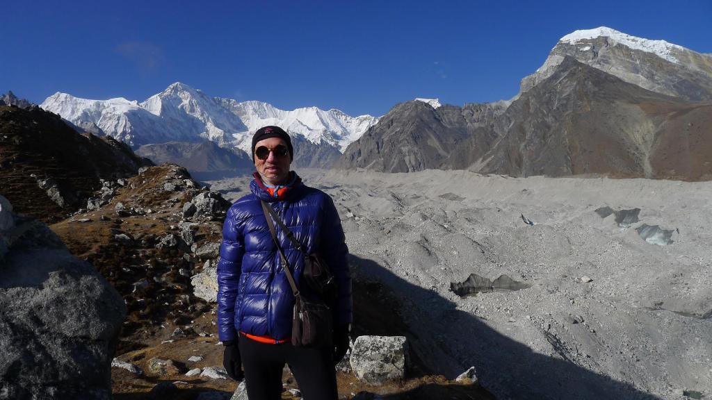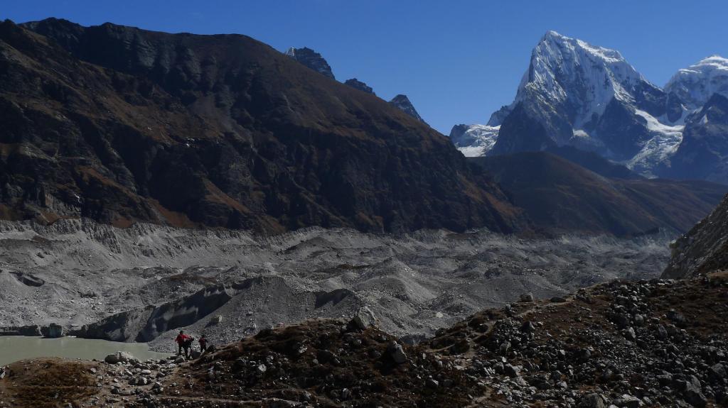 La segunda etapa del día comienza a las 10 de la mañana (Gokyo 4750m). Hay que subir la morrena y atravesar todo el glaciar. Como está cubierto de piedra el camino discurre entre pedreras y zonas arenosas, mientras vemos las paredes de hielo que asoman y pequeños laguitos de fusión. Es un subeybaja constante entre la inmensidad del glaciar, el Cho Oyu detrás y el Cholatse y Taboche delante.