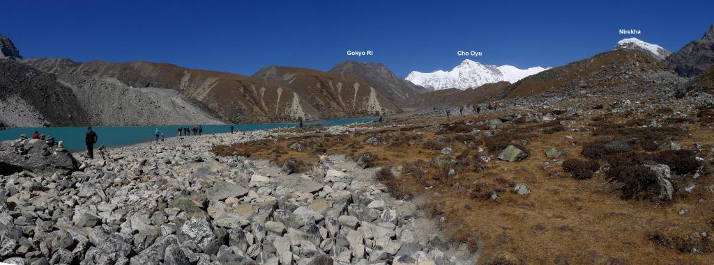 Pasamos una zona de cascadas a nuestra izquierda y el camino se empina con escaleras. La caminata es bastante tranquila, creo que solo coincidimos con dos grupos, aunque son bastante numerosos. Tras un estrechamiento llegamos a un 1º lago pequeño (Longponga Tsho). Luego entramos en una vaguada más plana que va a desembocar en el 2º lago, más grande (Tablche Tsho 4700m 2h54′), espectacular con el Cho Oyu al fondo. También destaca a nuestra derecha el Nirekha, lleno de glaciares colgados.