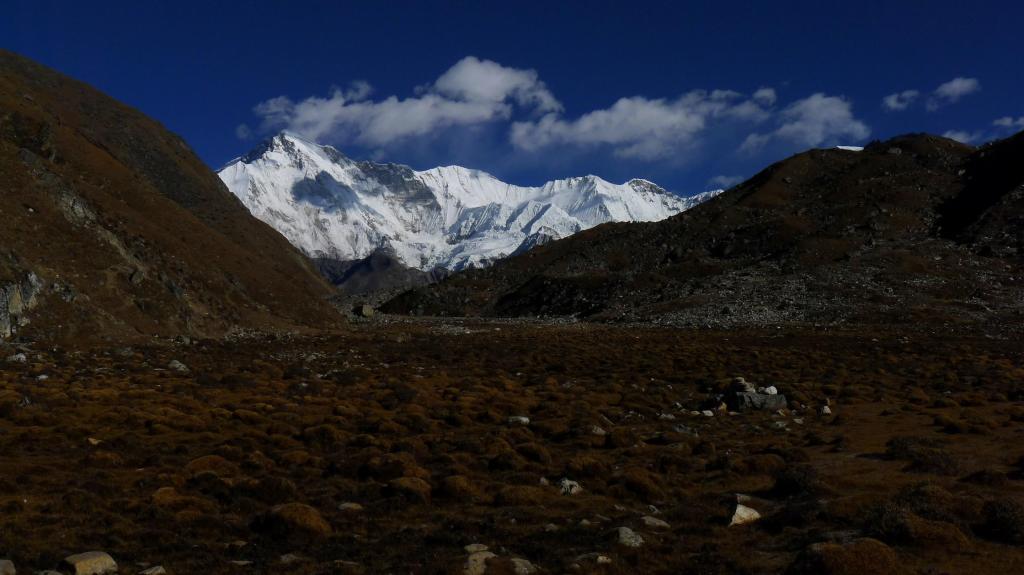 Salimos de Machermo (4390m) a las 8:10. Pasamos una arista y tomamos el sendero en suave subida a media ladera. La vegetación ya es muy rala, las laderas están peladas. Aparece magnífico el Cho Oyu delante de nosotros. A nuestra derecha el Cholatse y el Toboche que van quedando atrás. Y en el fondo del valle el Khantega y el Thamserku.