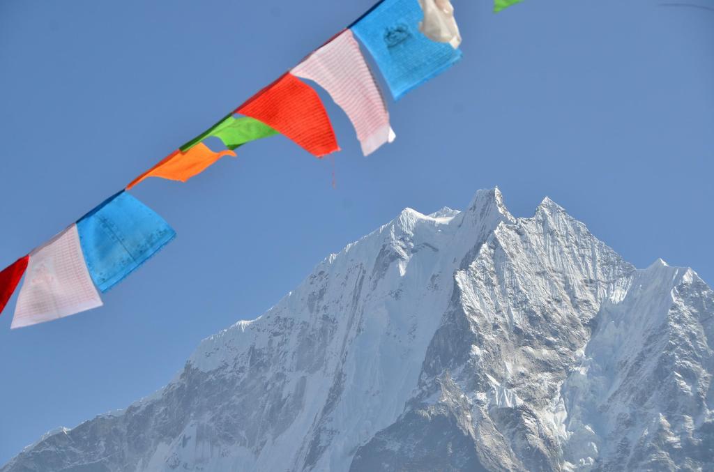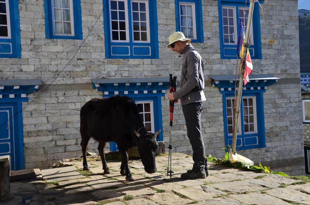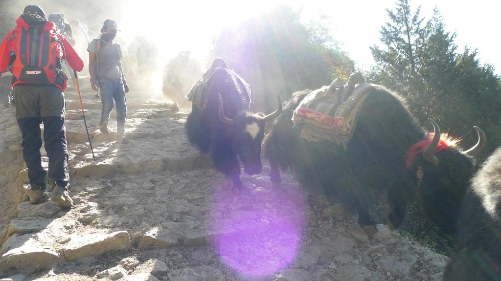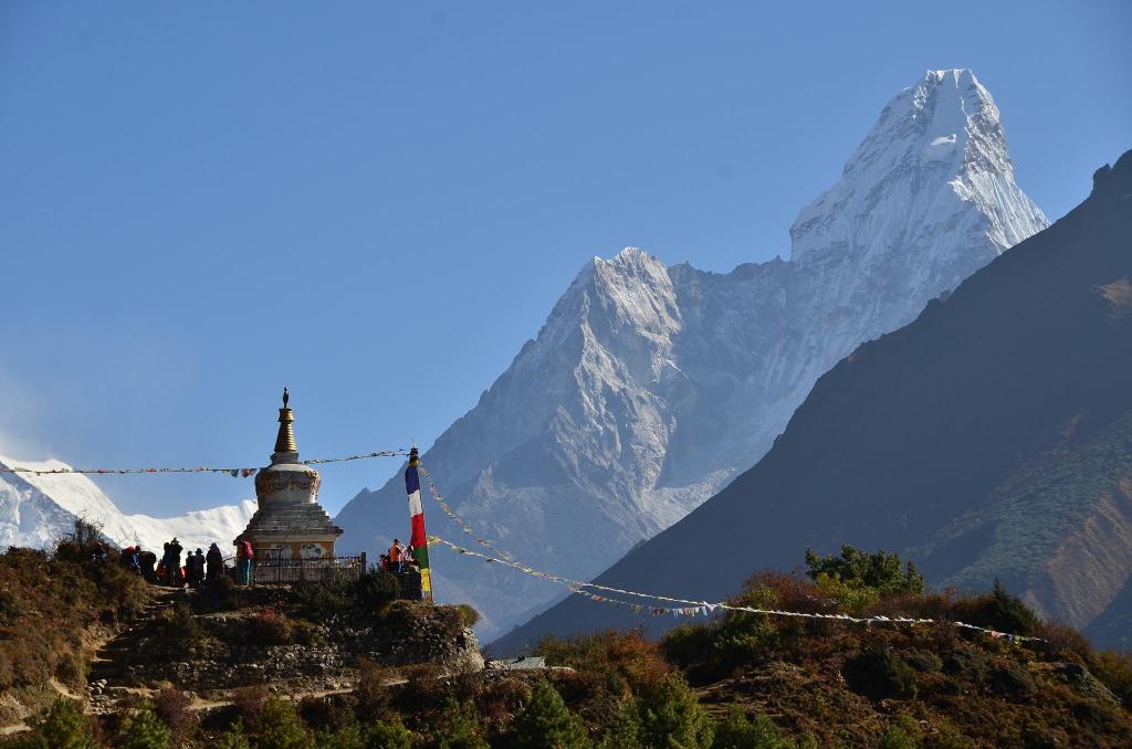 Bajamos a desayunar a las 7, con mochila y petate preparado. Salimos a las 8 de Namche (3445m) y comienza la procesión. El camino faldea a media ladera, bastante llano, por encima del río Dudh Koshi. Hay mucha gente y nos cruzamos con alguna recua de yaks. La vegetación todavía es bastante boscosa. Las vistas del Everest, Lhotse y Ama Dablan, de nuevo impresionantes. En cada recodo del camino hay una estupa.