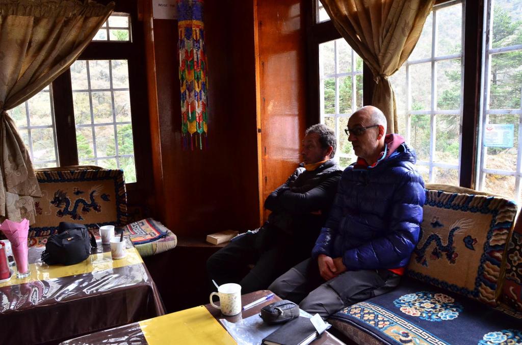 Paramos a comer en Mong (3985m3h05′), un pequeño pueblecito que está en el collado desde el que bajaremos a Phorse Tanga. El restaurante tiene un ventanal por el que entra un sol muy acogedor y con unas vistas espléndidas. En la ruta de hoy se van espaciando mucho los pueblos; son pequeños asentamientos con algún lodge y algún bar.