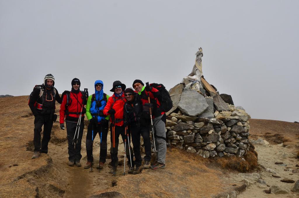 Al fin alcanzamos una estupa que marca el punto más alto del recorrido (4440m) y debajo está Machermo (4390m 6h28′), en una amplia llanura con el río a la derecha e imponentes picos a la izquierda. Primero hay un par de lodges, luego pasamos el río y subimos a nuestro lodge, de nombre Machermo, que está en lo que parece el núcleo del pueblo. Está bastante abarrotado y nos dan una habitación grande con dos estancias, una con 2 camas y otra con 4. Llegan nuestros petates y tratamos de organizarnos lo mejor posible.