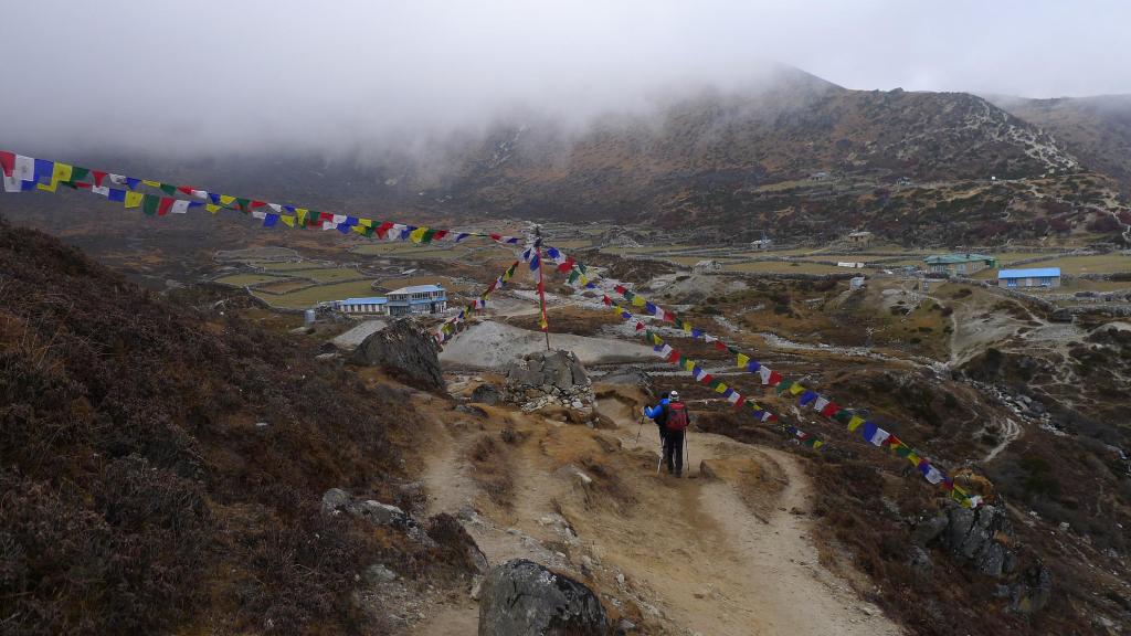 A la izquierda del Khantega vuelve a asomar la punta del Ama Dablan. Empiezan a formarse las nubes de la tarde, hoy bastante densas y oscuras. El camino sigue una ladera pelada, alto sobre el río, siempre en ligero ascenso. Poco a poco se va cubriendo todo el cielo y finalmente nos metemos en la niebla. El viento es fresco, me pongo el cortavientos. Pasamos el pueblo de Luza (4330m 5h48′).