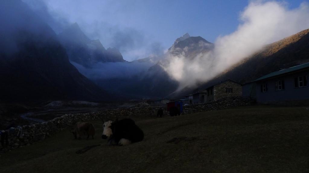 El pueblo de Phortse queda en la otra orilla, sobre un hombro que separa este valle del de Imja Khola, 200m más arriba. Nosotros nos quedamos en Phortse Thanga (3600m 5h31′), ahorramos esos 200m de subida que mañana tendríamos que descender, pero aquí abajo en el fondo del valle también es más húmedo y sombrío. En Phortse Thanga parece que no hay nada salvo algún lodge, pasamos por delante de uno y un poco más adelante está el nuestro, River Resort.
