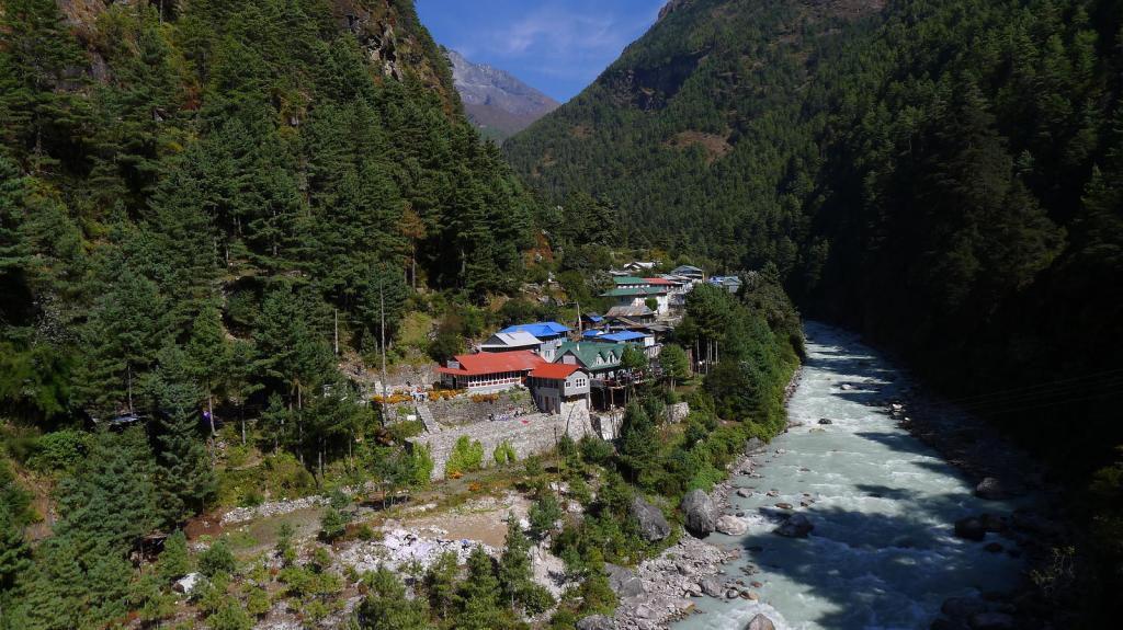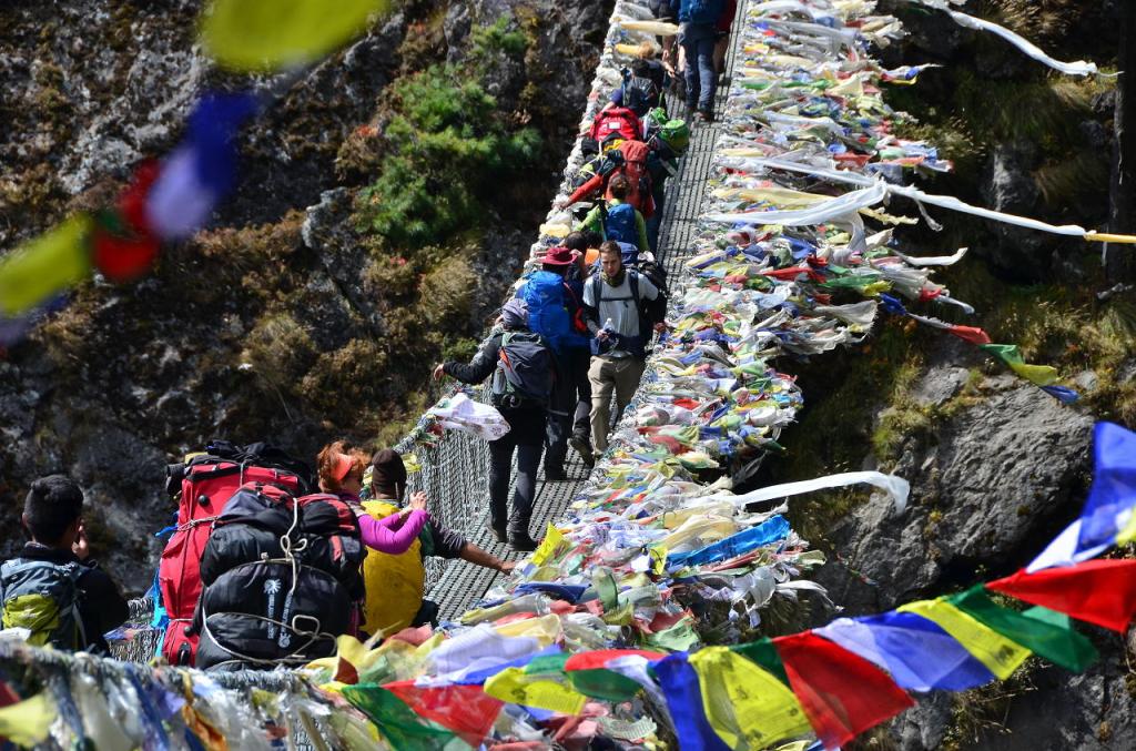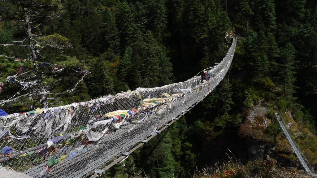 Amanece en Phakding (2553m) un día espléndido. El camino está abarrotado de gente. Es un subeybaja constante. En gran parte está empedrado y vamos pasando de una a otra orilla del río por puentes tibetanos vertiginosos. Se suceden pequeños pueblecitos con lodges y bares. Tenemos una gran vista del Thamserku (6618m) a nuestra derecha con sus laderas heladas verticales.