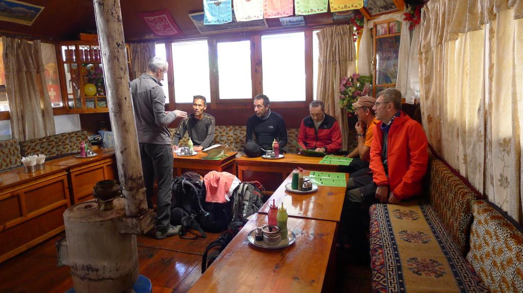 Nuestro lodge (3433m 7h03′) está en la zona alta, más arriba de calles con gran ajetreo de turistas y gente local, muchas tiendas de material de montaña y productos locales. Tomamos un té y subimos a descansar a las habitaciones. Por la tarde bajamos a un bar donde la wifi funciona muy bien, el Himalayan Java Cafe.