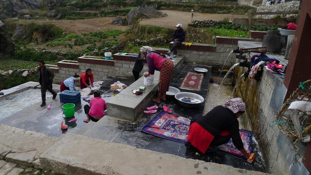 Hay que pasar un puesto policial (3302m 5h52′) donde los guías también tienen que registrar nuestro paso, ya cerca de Namche Bazar. La entrada en Namche (3397m 6h52′) me parece alucinante, no me esperaba una ciudad tan grande a esta altura. A la izquierda un gran lavadero con mujeres haciendo la colada, justo encima una estupa, a la derecha la calle que subimos jalonada de rodillos de oración movidos por el canal de agua que baja, y las casas trepando por las laderas de una especie de circo montañoso. Namche es el último núcleo que podemos considerar una ciudad, de aquí en adelante solo encontraremos pequeños asentamientos desarrollados más que nada en torno al turismo de trekking.