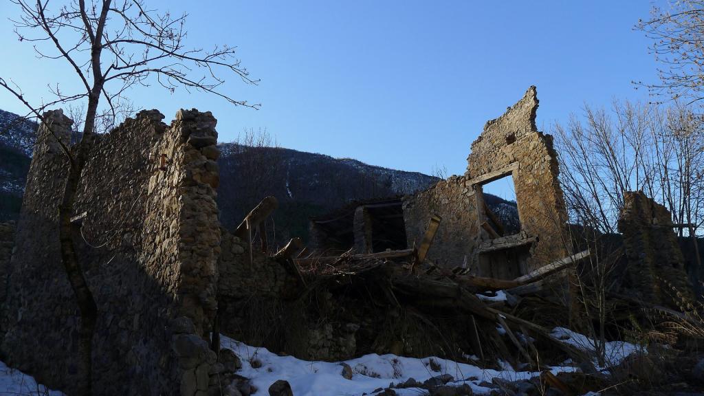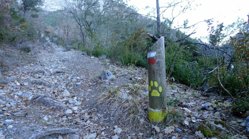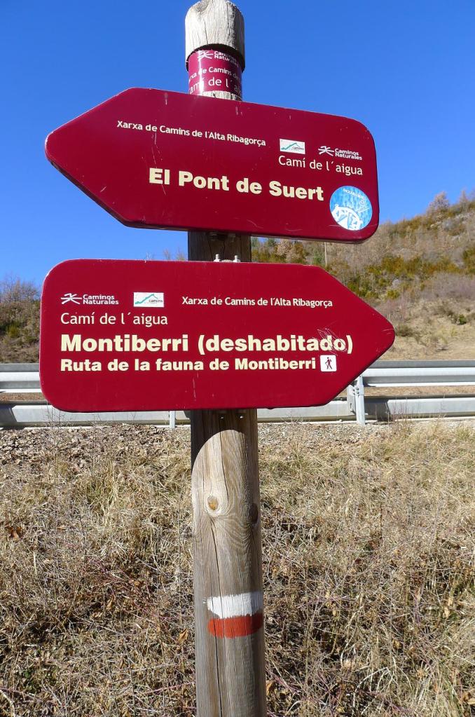 Se trata de una senda de la naturaleza, con paneles sobre la fauna de la zona. Asciende por pinar y tengo que tener cuidado porque esta zona umbría y húmeda tiene algo de hielo. La señalización de GR y los postes informativos no dan opción a pérdida. Se pasa después por un bosquete de carrascas y cruzo el barranco de Montiberri (1030m 0h32′). Más arriba está el pueblo abandonado de Montiberri (1123m 0h43′). Hasta aquí podría ser una suave excursión para toda la familia.