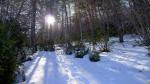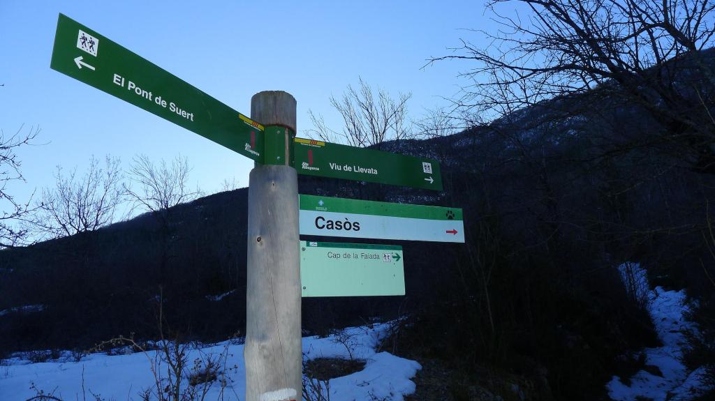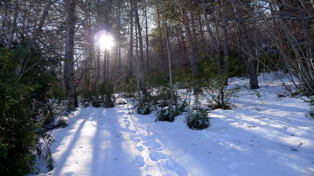 A partir de aquí se endurece, pero no mucho. Hay que cruzar entre las casas en ruinas hacia el sur y seguir las indicaciones ascendiendo por robledal. El sendero tiene hitos. Se cruza la pista que se dirige a Casòs (1205m 1h05′) varias veces y vuelvo a entrar en bosque de pinos con más espesor de nieve, pero con huella de otros caminantes. Se hace un gran flanqueo hacia el este.