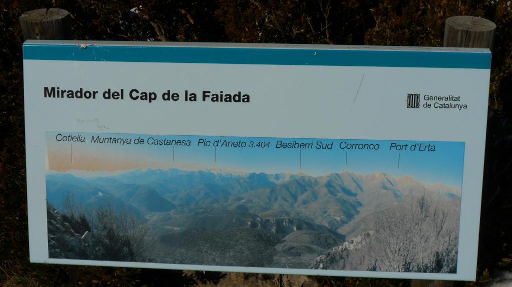 En la parte alta hay un hayedo, giro a la derecha y accedo al lomo superior, nevado y cubierto de boj. Aquí es un poco confuso, hasta que al fin veo el vértice geodésico que indica la cima del Cap de Faiada (1699m 2h02′), con un panel de orientación y una cumbre gemela al oeste con antenas de comunicaciones.