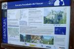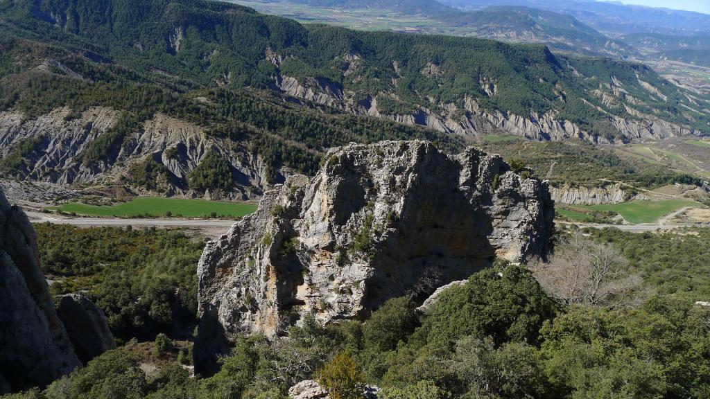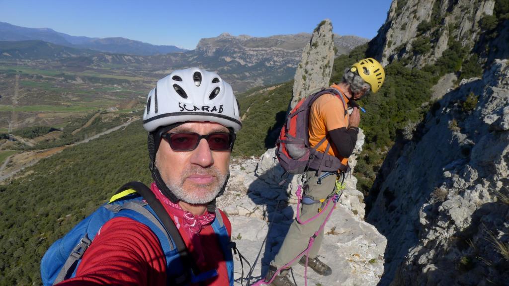 Entre el km. 144 y 145 de la carretera que une Campo y Aínsa hay un ensanchamiento para aparcar (990m), casi enfrente de una escultura con unas lanzas en honor al rey Gonzalo de la Ribagorza. No merece la pena meterse en coche por la pista, ya que la aproximación es muy breve, lo justo para calentar un poco. La pared de agujas calizas es impresionante. Hay un desvío a la derecha (1088m 0h10′), donde conectamos en el descenso. Al llegar a la pared hay un cartel informativo del inicio de la ferrata (1140m 0h18′). La vía está muy bien equipada y los tramos de cable de vida son cortos, lo que implica mucho mosquetoneo pero también mucha seguridad. Es exigente físicamente por tener largos tramos de gran verticalidad, así que calma y descansitos cuando sea necesario.