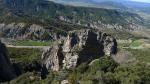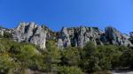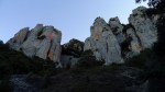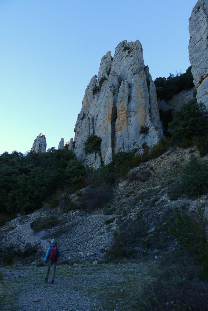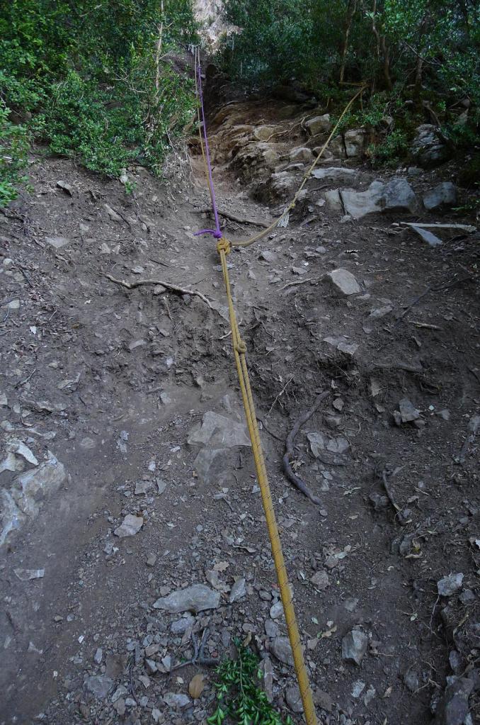 El descenso es un camino completamente erosionado y abarrancado en el que se han colocado varios tramos de cuerda para ayudar a no resbalar en la arenilla. Luego se introduce entre el bosquete de carrasca; hay algún hito, pero en un cierto momento perdemos la senda, aunque el descenso por el bosquecillo tampoco es muy problemático hasta conectar con la pista (1088m 3h22′) y continuar hasta el aparcamiento (990m 3h31′)