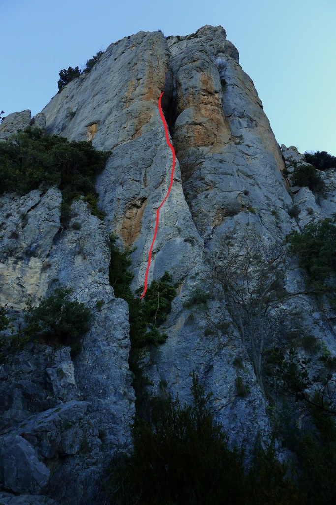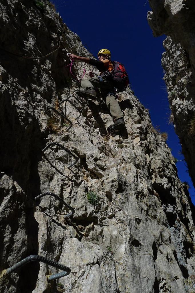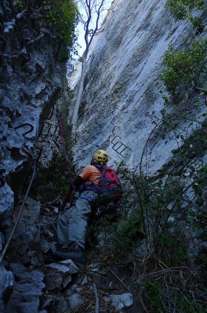 Comienza el ascenso por un espolón rocoso vertical que se introduce luego hacia la derecha en una chimenea. Se pasa a la pared de la derecha de la chimenea y continúa el ascenso vertical. Después nos encontramos una travesía horizontal a la izquierda y otro ascenso por chimenea que nos lleva al primer puente tibetano. Hay que pasarlo en equilibrio sobre una sirga.