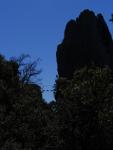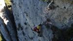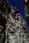 Tras el puente nos enfrentamos a un muro vertical que conduce hasta la cima del pitón rocoso. Al otro lado de la estrecha cumbre se realiza un pequeño descenso y se pasa a la pared de enfrente para seguir con una travesía horizontal vertiginosa. Dando la vuelta a esta muro se encuentra el segundo puente tibetano, que tiene escalones para los pies. Para asegurarse en los puentes hay que pasar por debajo del cable lo que obliga a hacer un cierto equilibrio. Aún queda algún tramo vertical pero, en general, ya se pierde verticalidad, nos apoyamos más en la roca en vez de en grapas y hay algo de vegetación.