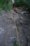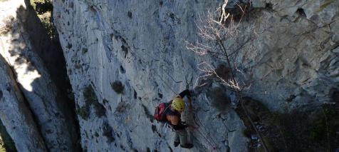 Comienza el ascenso por un espolón rocoso vertical que se introduce luego hacia la derecha en una chimenea. Se pasa de la pared de la derecha de la chimenea y continúa el ascenso vertical. Después nos encontramos una travesía horizontal a la izquierda y otro ascenso por chimenea que nos lleva al primer puente tibetano. Hay que pasarlo en equilibrio sobre una sirga.