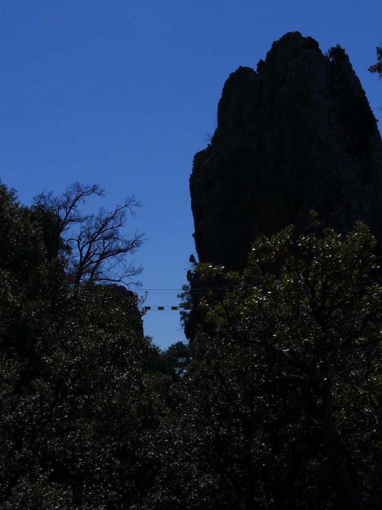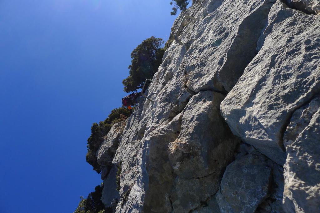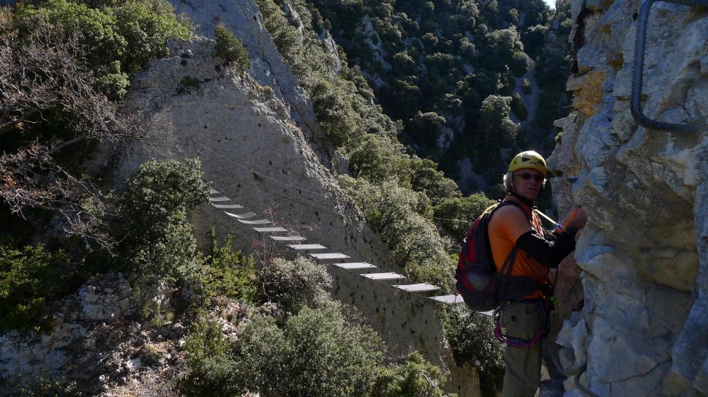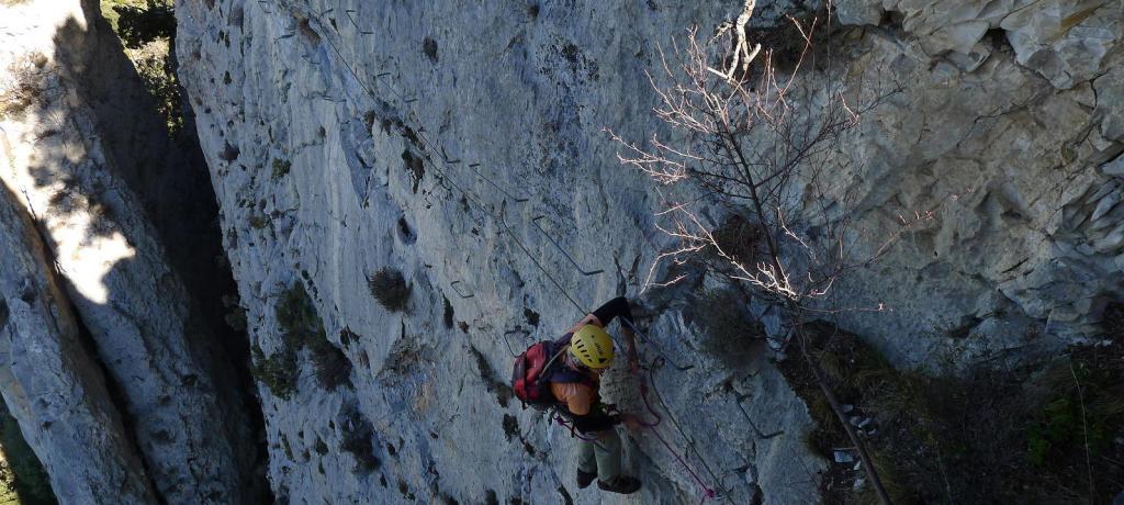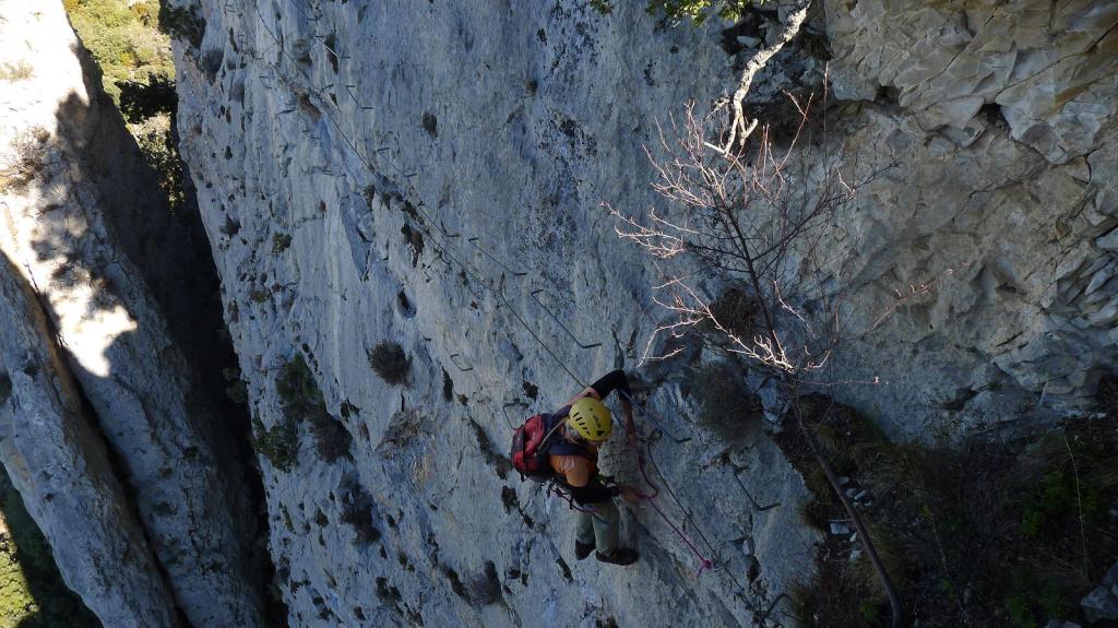 Tras el puente nos enfrentamos a un muro vertical que conduce hasta la cima del pitón rocoso. Al otro lado de la estrecha cumbre se realiza un pequeño descenso y se pasa a la pared de enfrente para seguir con una travesía horizontal vertiginosa. Dando la vuelta a este muro se encuentra el segundo puente tibetano, que tiene escalones para los pies. Para asegurarse en los puentes hay que pasar por debajo del cable lo que obliga a hacer un cierto equilibrio. Aún queda algún tramo vertical pero, en general, ya se pierde verticalidad, nos apoyamos más en la roca en vez de en grapas y hay algo de vegetación.