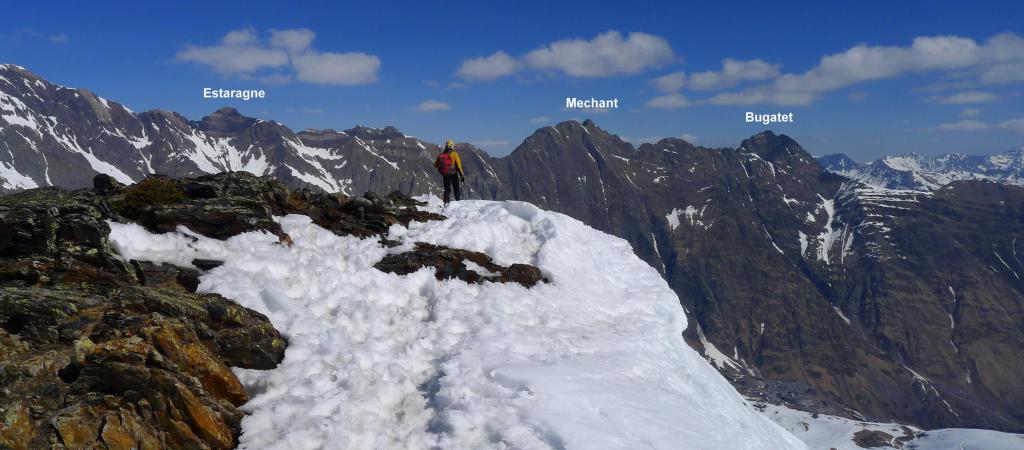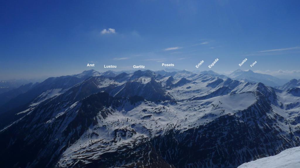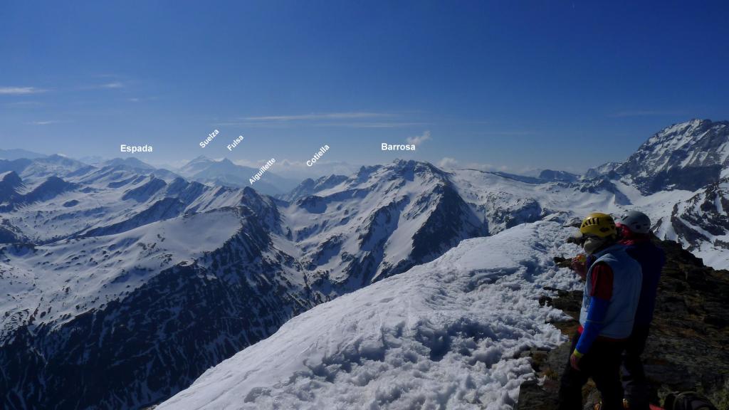 Pasamos un rato en la cima haciendo fotos y admirando el panorama. Decidimos bajar por la arista N y NNW que desciende más suavemente hasta el final de la telesilla Pic de Piau y andamos por el borde de la pista para recuperar los esquís que habíamos dejado sobre un lomo herboso.
