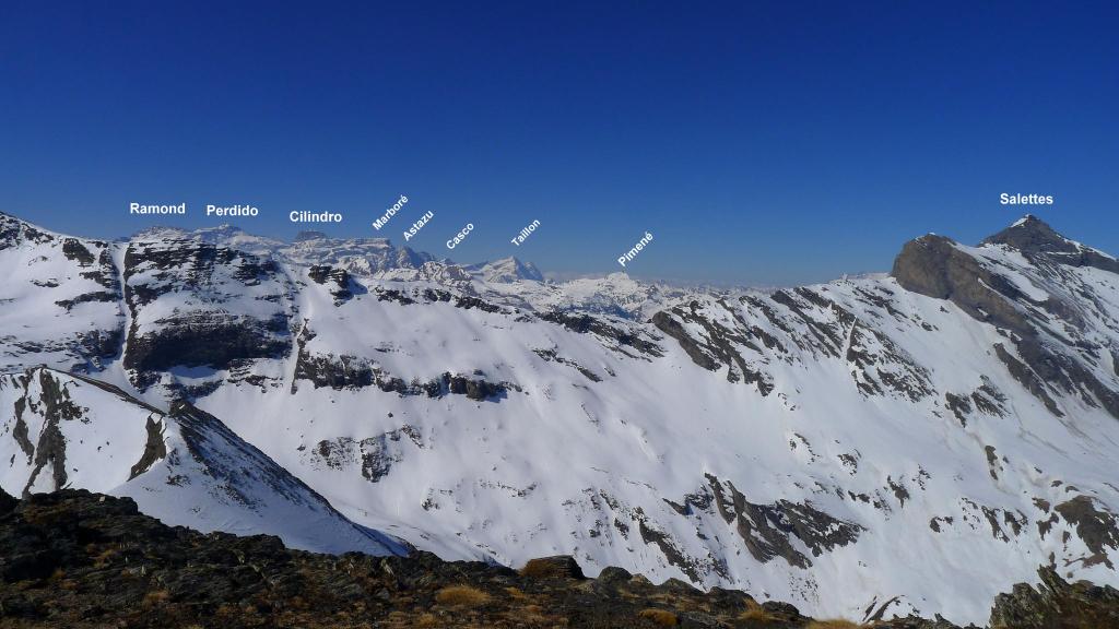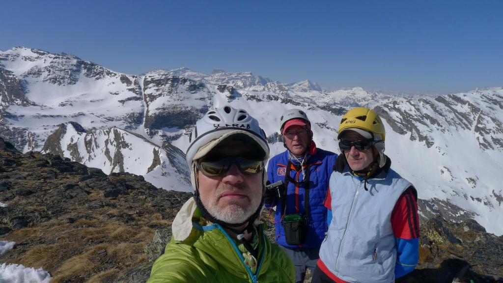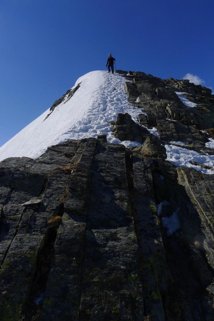 Seguimos esta pista hasta la cota 2485m (2h11′). Allí ponemos los crampones y afrontamos la arista NE del pico. Hay algunos pasos entre roca y nieve donde tomamos precauciones. Finalmente alcanzamos la cresta N que recorremos hasta la cima (2696m 3h03′).