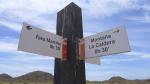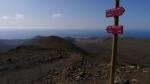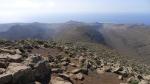 Al llegar al vértice geodésico del pico de la Zarza (812m 1h52′) nos asomamos a la playa de Cofete, bajo nuestros pies. Pasamos un buen rato en la cima, esperando que se vayan unos franceses escandalosos para disfrutar de unos momentos tranquilos. Muchas veces los vientos alisios chocan contra la montaña y forman una nube en la cumbre, pero hoy tenemos la suerte de una vista completamente despejada.