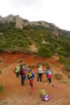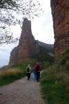 Salimos del pueblo de Riglos (635m) hacia el NW por la base del mallo Pisón y el Puro. La ruta se introduce entre estos mallos y el Fire, con una fuerte subida que conduce a una especie de collado (855m 0h57′) donde confluyen varias rutas.
