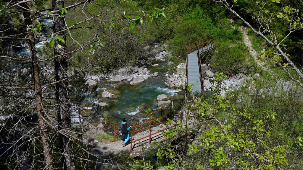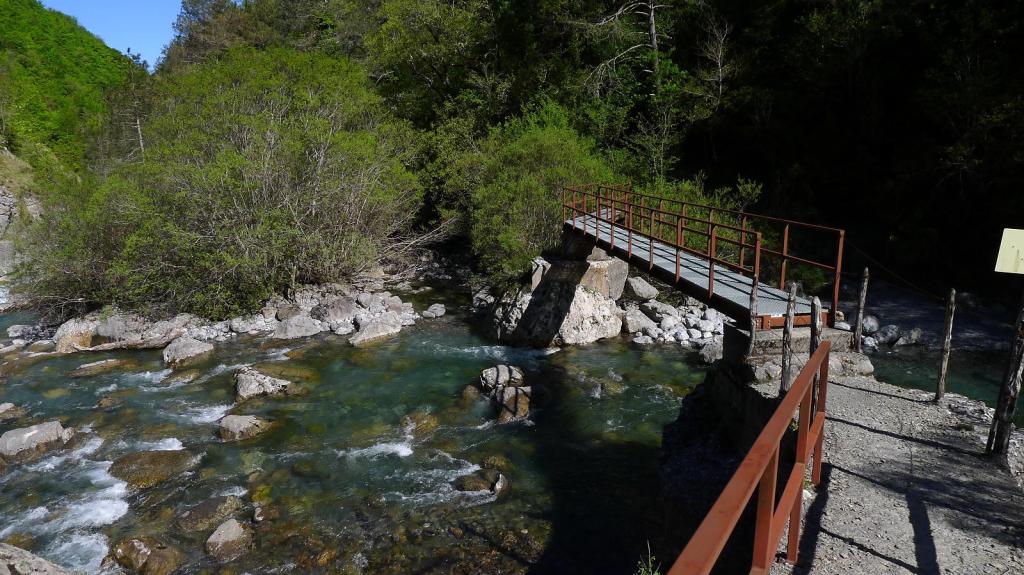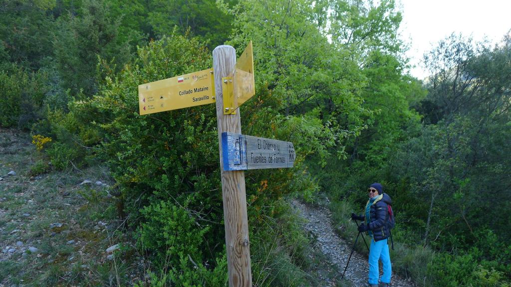 En el pueblo de Badaín (730m) encontramos los carteles que indican el inicio del recorrido, compartido con el GR-15. Unos metros más arriba seguimos el GR hacia la derecha y, enseguida, dejamos el GR para desviarnos a la derecha (775m 0h08′). El camino discurre por pinar con algún roble sobre la orilla derecha del río Irués hasta llegar a un puente (780m 1h00′) en la confluencia con el barranco de la Garona.