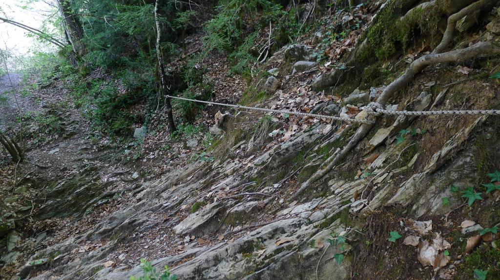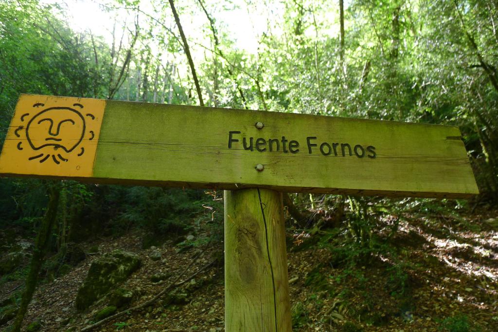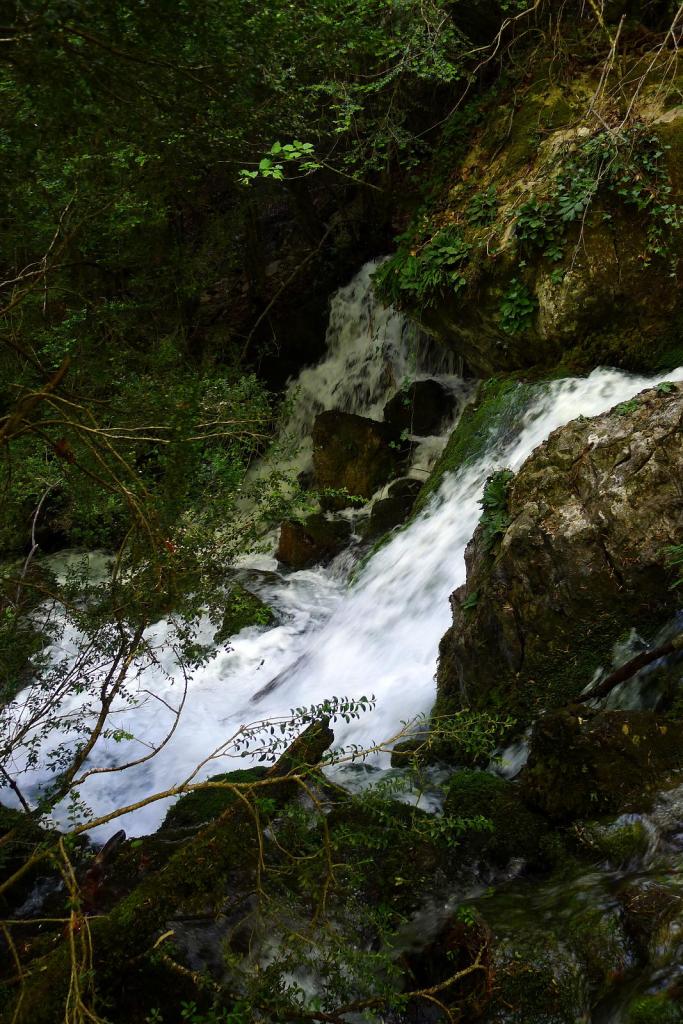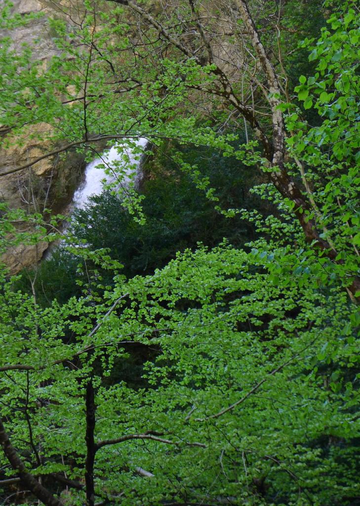 Llegamos a la Fuente de Fornos ((865m 1h29′), un conjunto de surgencias en la roca caliza, entre abundante vegetación. El sendero continúa por hayedo un poco más complicado. Hay dos pasos rocosos equipados con cuerda que, si bien no son difíciles, quizá no sean aptos para niños o personas no acostumbradas a estas lides. Finalmente no alcanzamos el Chorro de Fornos (905m 2h05′) ya que hay que atravesar la corriente usando unas grapas y unas cuerdas sobre rocas húmedas, aunque el Chorro ya está a la vista y parece bastante espectacular; supongo que merece la pena acercarse.