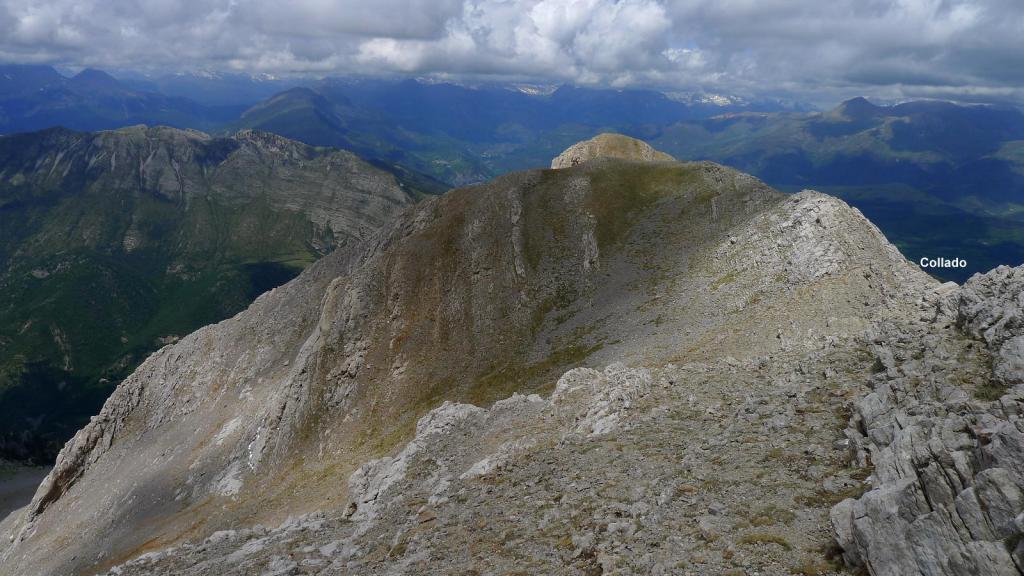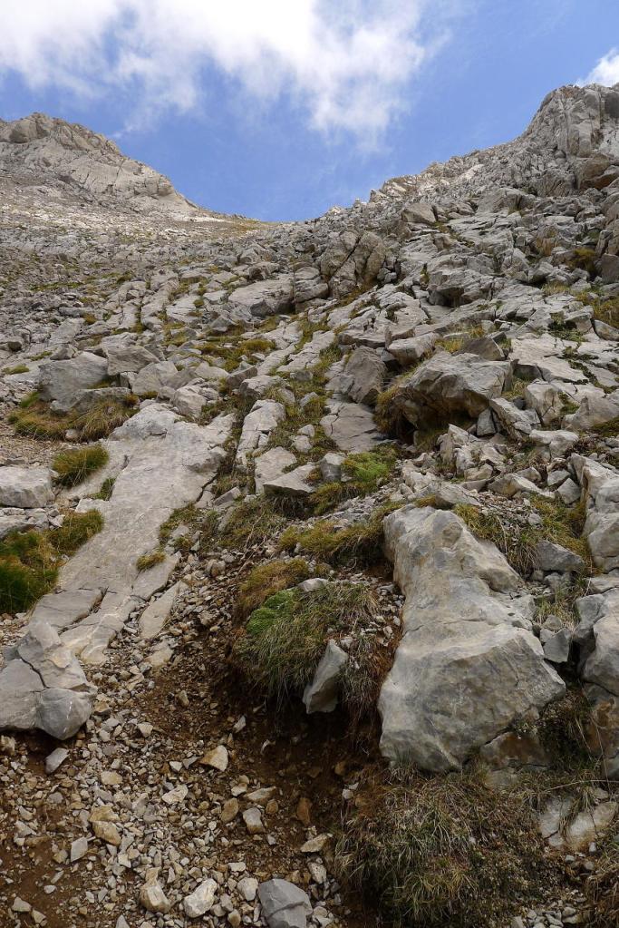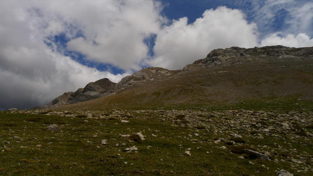 El día está cubierto con nubes bastante negras, así que no quiero entretenerme por si descarga alguna tormenta. Ya se visualiza la ancha canal pedregosa que asciende al collado, a la izquierda del Turbón. La pendiente es fuerte y hay gravilla, pero no es muy incómoda la subida y la ruta es evidente (algunos hitos).