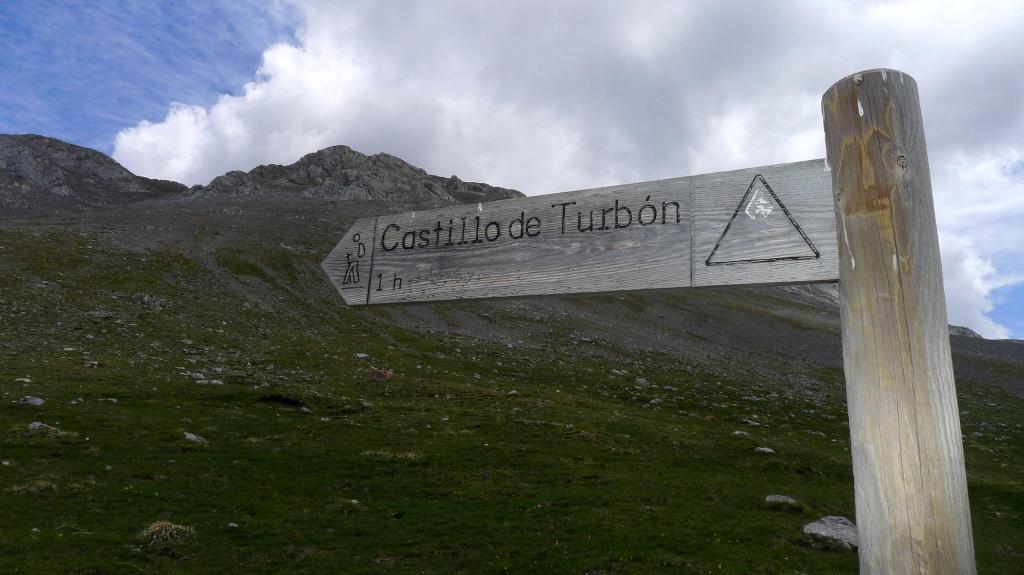 Aparco el coche a 2.8km de empezar la pista (1540m) y me quedan otros 3.5km andando. Me salgo de las pista a la derecha (Fuente de la Pedreña 1960m 0h40′), sin pasar por el refugio de la Plana, aunque sería mejor andar un poco más por la pista hasta el punto donde la tomo de bajada. En cualquier caso por aquí tampoco hay problema, enseguida son prados por los que se avanza fácilmente hacia el suave lomo donde, a pesar de que casi no hay senda, se ve el poste indicador de la ruta (cartel Castillo del Turbón 2085m 0h56′).