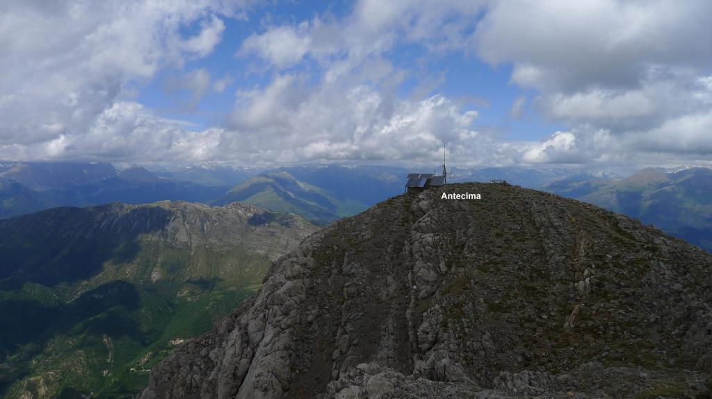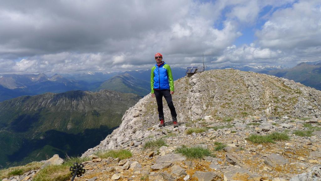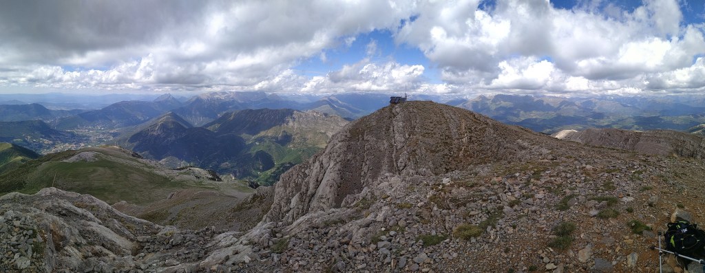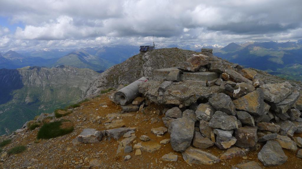 Antes de llegar al collado me desvío a la derecha (2435m 1h28′) por una vira bastante clara, subiendo por piedras, prácticamente ni siquiera hay que apoyar las manos. Se llega a una antecima con una antena y una mesa de orientación (todo el Pirineo está cubierto, así que no veo ningún pico desde esta atalaya privilegiada). Unos metros más allá, la cima del Turbón (2492m 1h36′). Me encuentro con dos montañeros jubilados que me ofrecen su bota de vino.