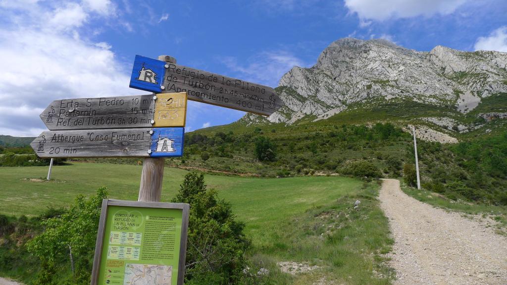 Tenemos otra ruta de subida en el blog, pero en esta ocasión hago la más directa, por el refugio de la Plana. En la rotonda antes de llegar a Campo tomo la carretera hacia las Vilas del Turbón. Me salgo a la izquierda hacia Egea, de ahí me dirijo a Serrate y, justo antes de el cartel de entrada en el pueblo, hay indicación a la izquierda al Refugio del Turbón. Se toma la pista que sube al refugio, al que se puede llegar en un vehículo que sea más alto que un turismo porque es una pista bastante pedregosa y con algunas roderas profundas.