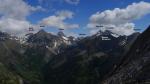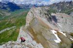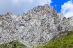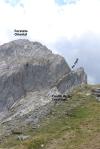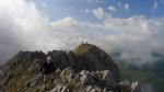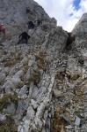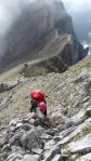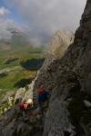 Desde aquí, una sucesión de chimeneas, trepadas por laderas de roca, aún con algo de vegetación, algún otro tramo con cuerda fija y cortos pasos horizontales, siempre sin superar el IIº, y siguiendo las marcas de pintura roja, hasta la cima de la Foratata Oriental (2329m 3h36′). Mientras pasamos un rato en la cumbre las cimas a nuestro alrededor se van despejando mostrándonos una vista espectacular.