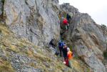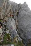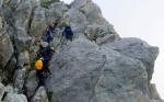 Termina la faja cuando encontramos una chimenea rocosa a la izquierda en la que hay una cuerda fija y las señales rojas que marcan el resto del ascenso.Probablemente esta 1ª trepada sea la más compleja. La cuerda hace una comba hacia la izquierda pero el paso más sencillo es por la derecha. Ricardo se lanza para arriba, Ramón nos abandona y se vuelve para esperarnos en la cara norte cuando bajemos.