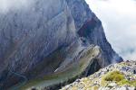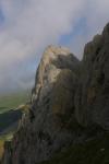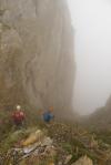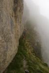 Descenso por el mismo camino, pero ahora nos dirigimos al Cuello entre las dos Foratatas (2209m 2h41′), una auténtica brecha que se asoma con verticalidad hacia la cara sur. Por esa empinada canal de tierrilla descendemos unos 40m para alcanzar la faja herbosa o vira sur, que avanza hacia la izquierda en ligero ascenso. La faja es amplia, se anda con tranquilidad, además la niebla no nos deja ver la caída a nuestra derecha.