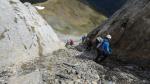 Un poco más adelante estamos sobre una brecha en forma de embudo muy característica. Descenso directo hacia la cara norte, por la piedrilla con trazas de paso de este embudo para desembocar en la roca (aquí también hay un paso con una cuerda, aunque bajamos mejor por la derecha). Ya en la roca nos vamos a la izquierda hasta conectar con la senda de ascenso que venía del Cuello del Forato (2195m 5h16′).