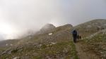 Allí dejamos el PR y nos vamos a la derecha, ascendiendo por el lomo occidental de la Peña Foratata (hitos y señal de pintura azul). El día, nublado desde el principio, se va cerrando en una niebla que nos deja ver la montaña como una figura fantasmagórica. Con las paredes de la Foratata Occiental a nuestra derecha, avanzamos por pedreras y un par de pequeños neveros. En este recorrido hay un destrepe entre rocas, sin problemas.