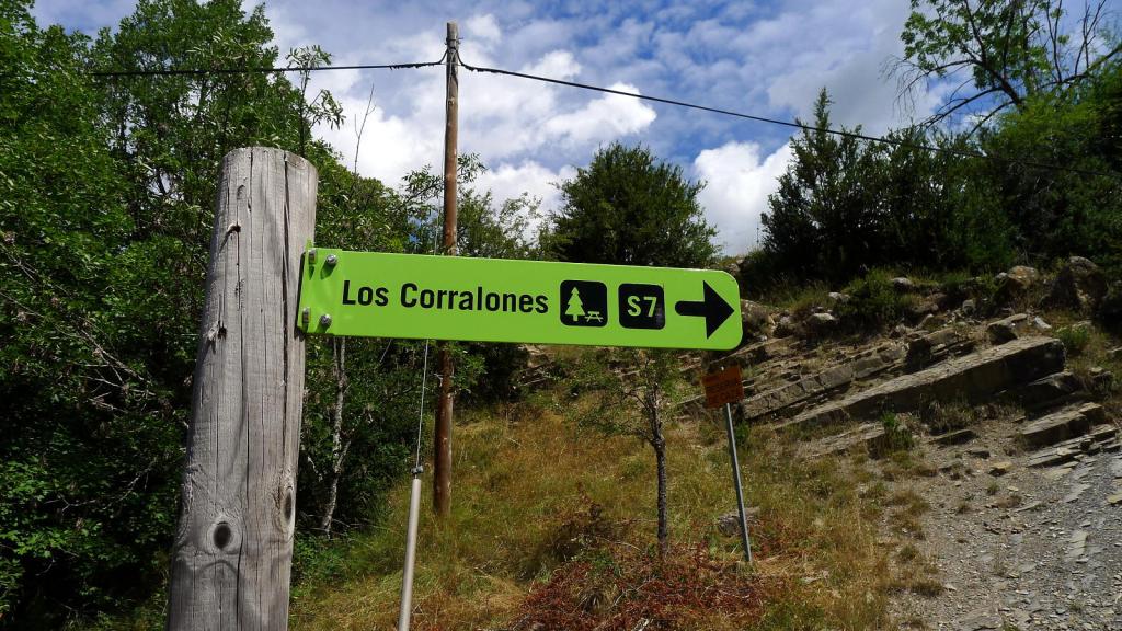 Subiendo desde Aragüés del Puerto hacia el reffugio de Lizara se aparca justo antes de pasar el puente Labati (1110m). Allí sale una pista que enseguida gira a la izquierda (1170m 0h12′) dejando la pista que sigue recto señalizada como camino a los Corralones. Esta pista que seguimos está poco usada, probablemente un antiguo camino maderero.