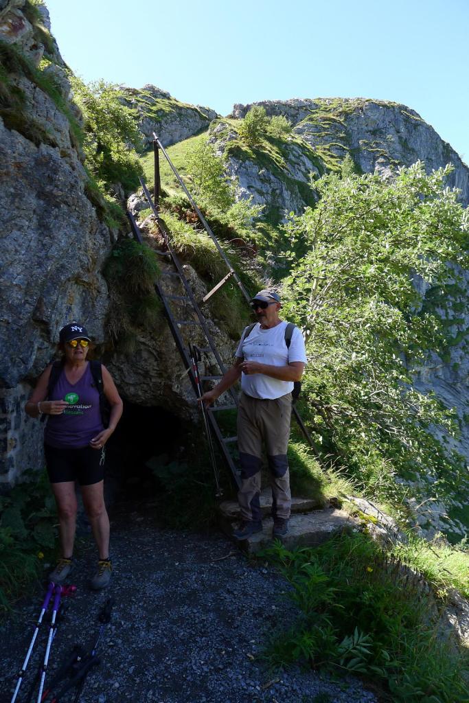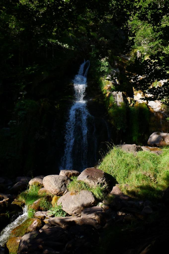 En el extermo N del lago se abre el Paso de l’Echelle (1775m 3h30′) hacia Francia. En el descenso hay un par de pasos rocosos más delicados ya que la pendiente es fuerte y finalmente una escalera de unos 3 o 4m. que salva un paso vertical. A partir de aquí un sendero desciende por el bosque, aunque la humedad hace que esté algo resbaladizo. Se pasa junto a una caseta (1620m 4h30′) y, cuando ya entramos en zona llana, tomamos la bifurcación a la izquierda (1413m 5h13′), dejando el camino a Sansanet a la derecha. Pasamos sobre un puente (1380m 5h19′) el barranco de Escalé y ya estamos en el bosque de la cascada de Espelungueres y en el aparcamiento (1330m 5h33′).