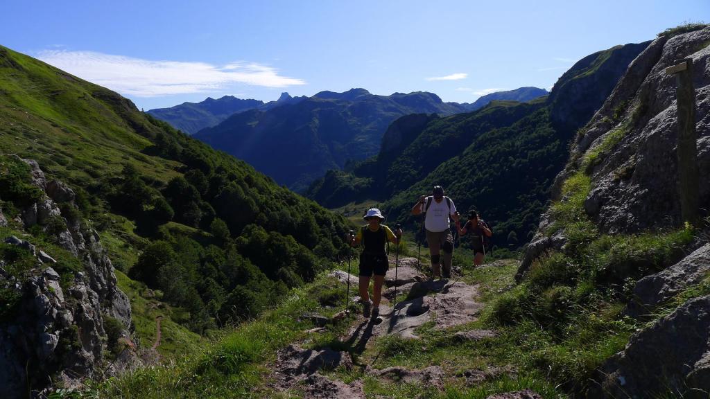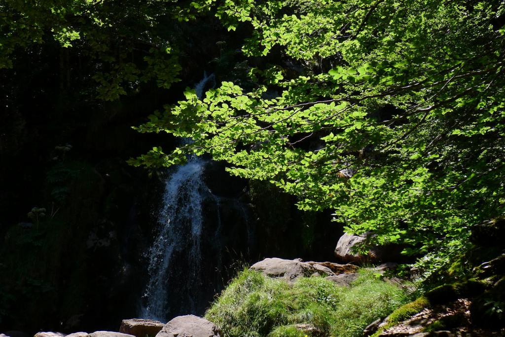 La subida por el bosque de hayas nos descubre al poco de empezar la impactante cascada de Espelungueres, no tan espectacular como en primavera, pero siempre preciosa. Al salir del bosque tenemos que seguir recto (cartel 1420m 0h22′), dejando el camino hacia Arlet a la derecha. En suave ascenso, a veces por hayedo, llegamos al Paso de Escale´(1640m 1h13′), una brecha por la que pasamos al valle de Echo.
