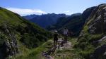 En el extermo N del lago se abre el Paso de l’Echelle (1775m 3h30′) hacia Francia. En el descenso hay un par de pasos rocosos más delicados ya que la pendiente es fuerte y finalmente una escalera de unos 3 0 4m. que salva un paso vertical. A partir de aquí un sendero desciende por el bosque, aunque la humedad hace que esté algo resbaladizo. Se pasa junto a una caseta (1620m 4h30′) y, cuando ya entramos en zona llana, tomamos la bifurcación a la izquierda (1413m 5h13′), dejando el camino a Sansanet a la derecha. Pasamos sobre un punete (1380m 5h19′) el barranco de Escalé y ya estamos en el bosque de la cascada y en el aparcamiento (1330m 5h33′).