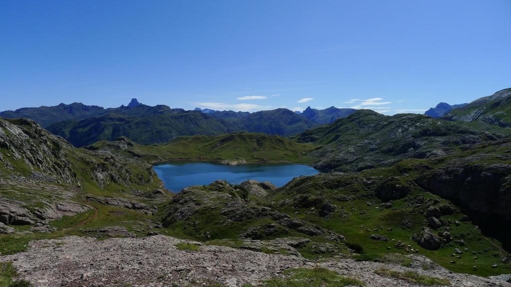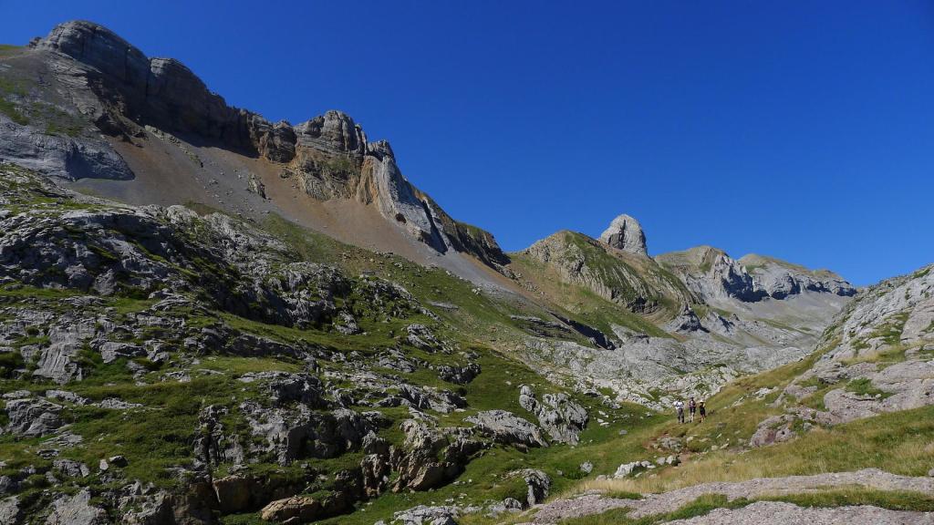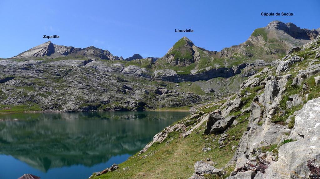 Avanzamos por zona de prados y giramos a la izquierda para unir nuestros pasos al GR-11 (1690m 1h37′). El GR sigue subiendo, con alguna zona de rocas, hasta una cota máxima de 1926m pasando entonces a la cuenca del lago. Llegamos a la orilla del ibón de Estanés (1755m 3h06′) y lo bordeamos por el N, con algún paso en el que hay que tener un poquito de cuidado. El lago es un entorno idílico para disfrutar de las vistas y del almuerzo.