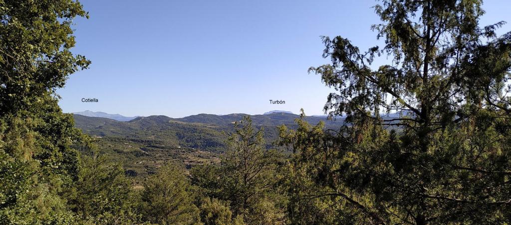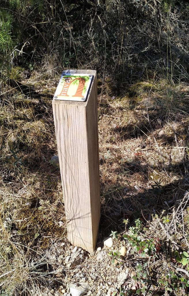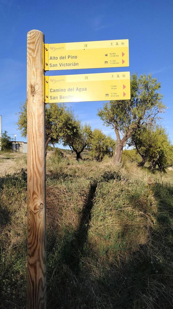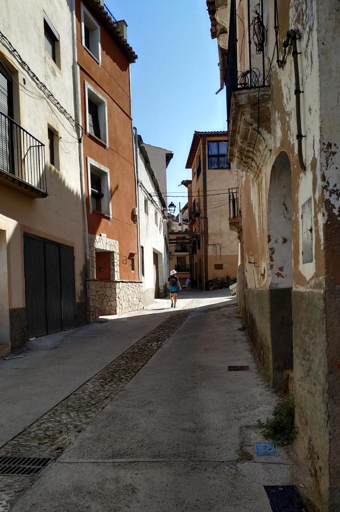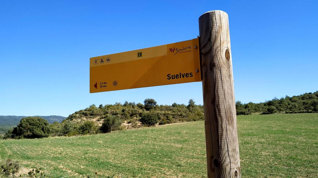 Pasamos el puente tras un giro a la izquierda (655m 0h53) y comienza la subida, dejando a la derecha el barrio de la Iglesia y finalmente hasta Suelves (775m 1h14′). Antes de entrar en el pueblo se toma a la izquierda un camino (nosotros seguimos hacia el pueblo y tenemos que volver atrás). Aquí empieza, como decía, la parte más agradable, con vegetación de encina y enebro y, más arriba, también pinos.