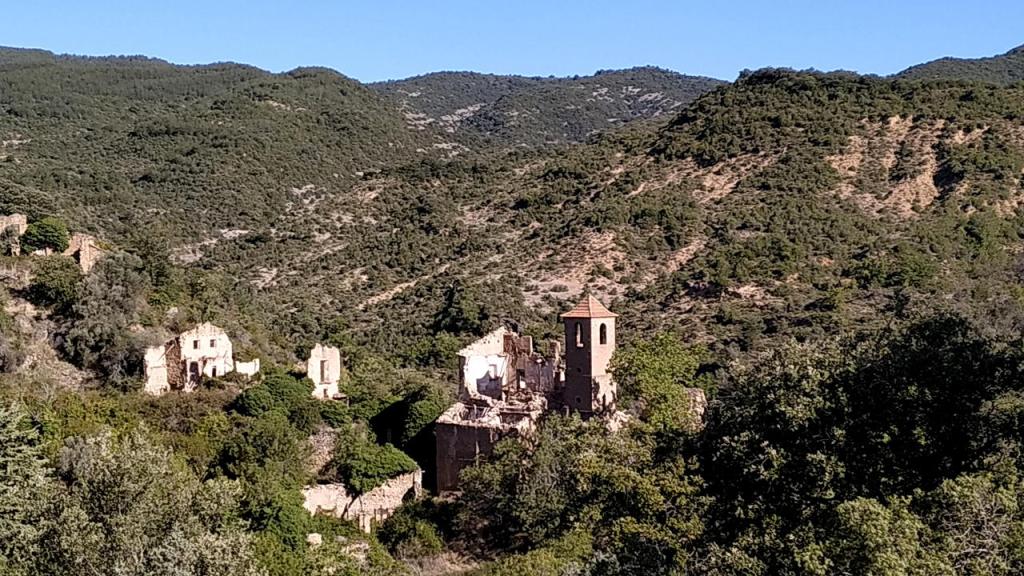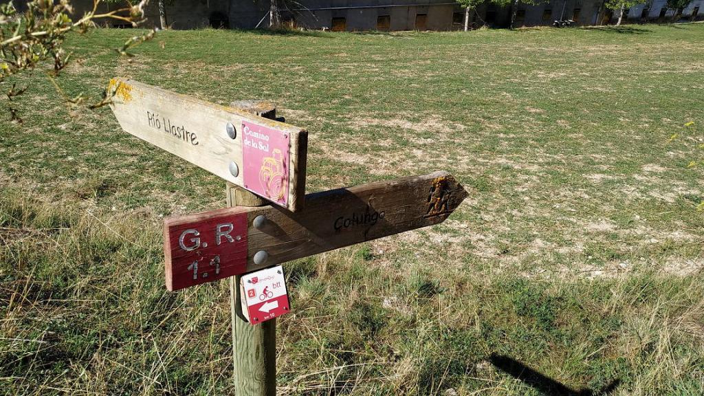 En una bifurcación se toma a la izquierda (820m 1h52′) en bajada, hasta conectar con un camino principal (815m 1h59′), que seguimos también a la izquierda. Hay una fuerte bajada por pista con gravilla y piedras. Así se llega, tras atravesar unos prados, hasta el lecho seco del río Llastra (585m 2h37′) que cruzamos para tomar la fuerte subida al pueblo que va directa a la Plaza Mayor (635m 2h45′).