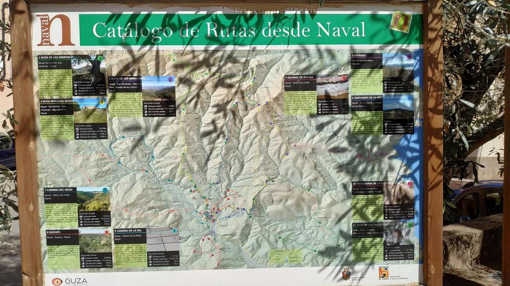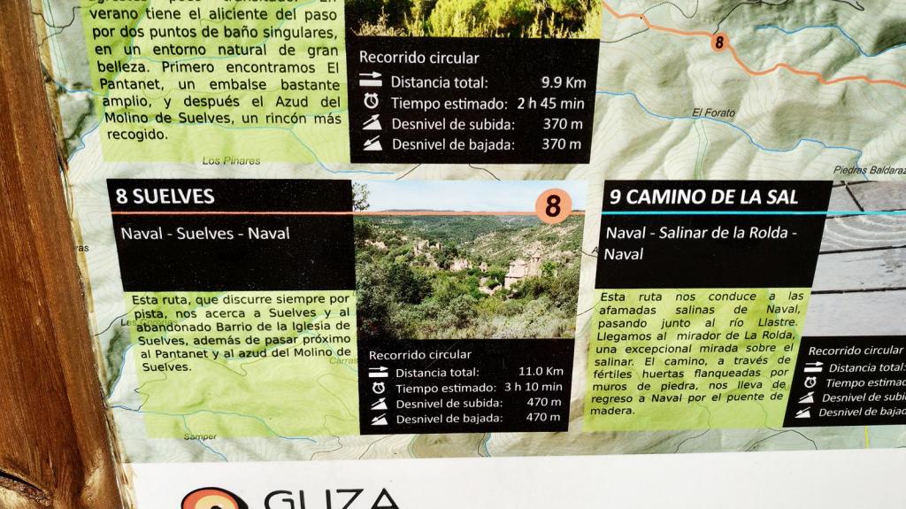 Ruta circular sencilla que parte de y regresa a Naval, pasando por el pueblo de Suelves. La primera parte se desarrolla por carretera y pistas. La parte que hacemos desde Suelves hasta Naval es mucho más atractiva, algo por pistas, pero también por caminos y zonas de monte más agradable. La excursión termina bajando a las salinas donde nos damos un baño en sus piscinas de agua salada, donde relajar cuerpo y mente.