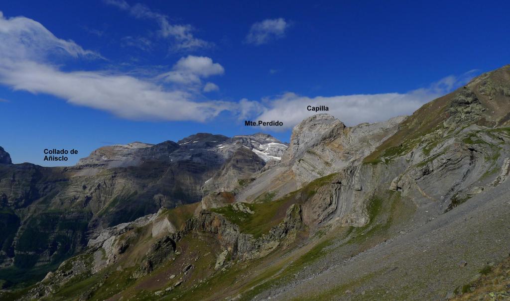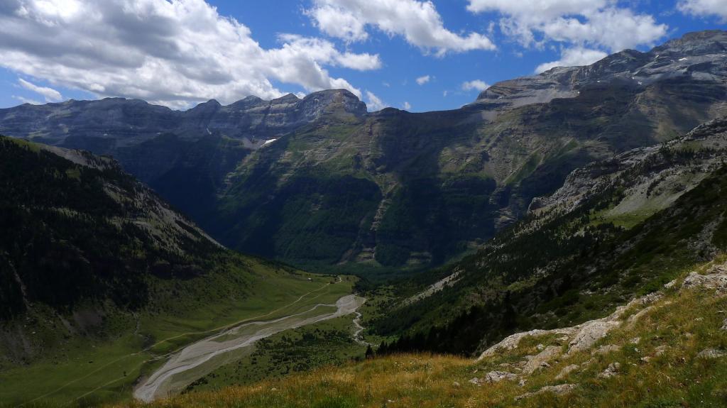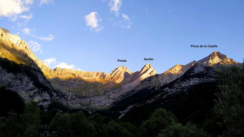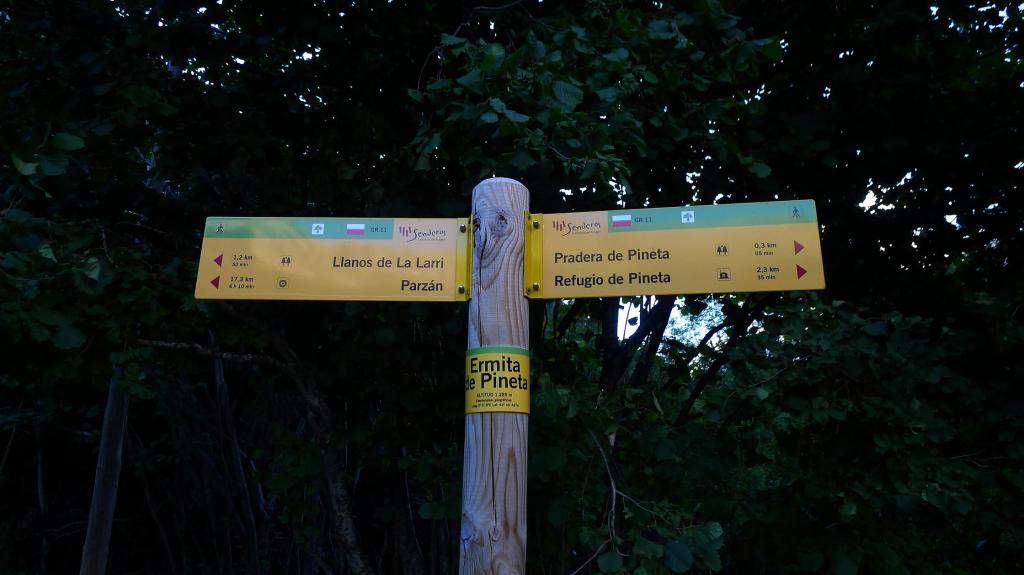 El aparcamiento (1275m) se sitúa en la explanada acondicionada (con pago de una pequeña cantidad que no me acuerdo si son 2€), pasando el puente antes de llegar al parador de Pineta. Subimos por la carretera y a la derecha, en la fuente junto a la ermita, tomamos el GR-11 que sube por el hayedo hacia los llanos de la Larri. Cruzamos la pista (1515m 0h24′) y, un poco más arriba, salimos otra vez a la pista que da paso a los Llanos de la Larri (1565m 0h30′) donde hay un panel informativo sobre el glaciar de Monte Perdido.