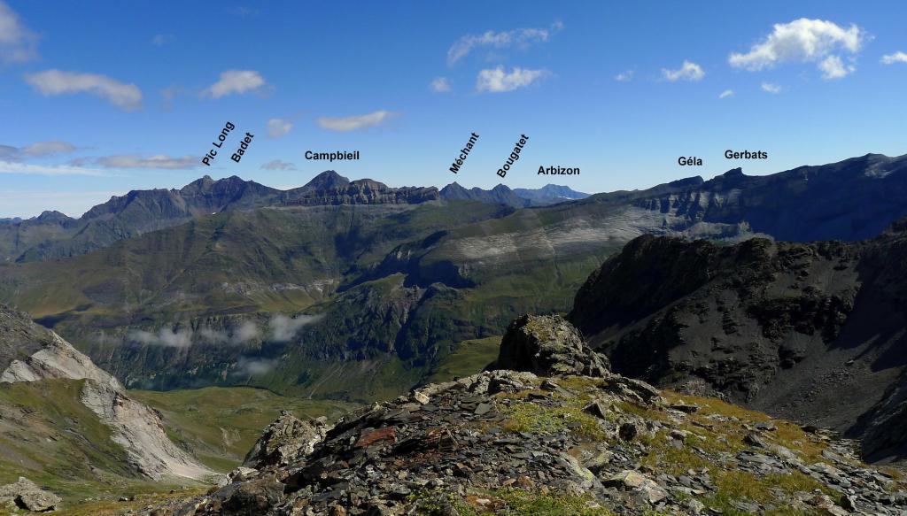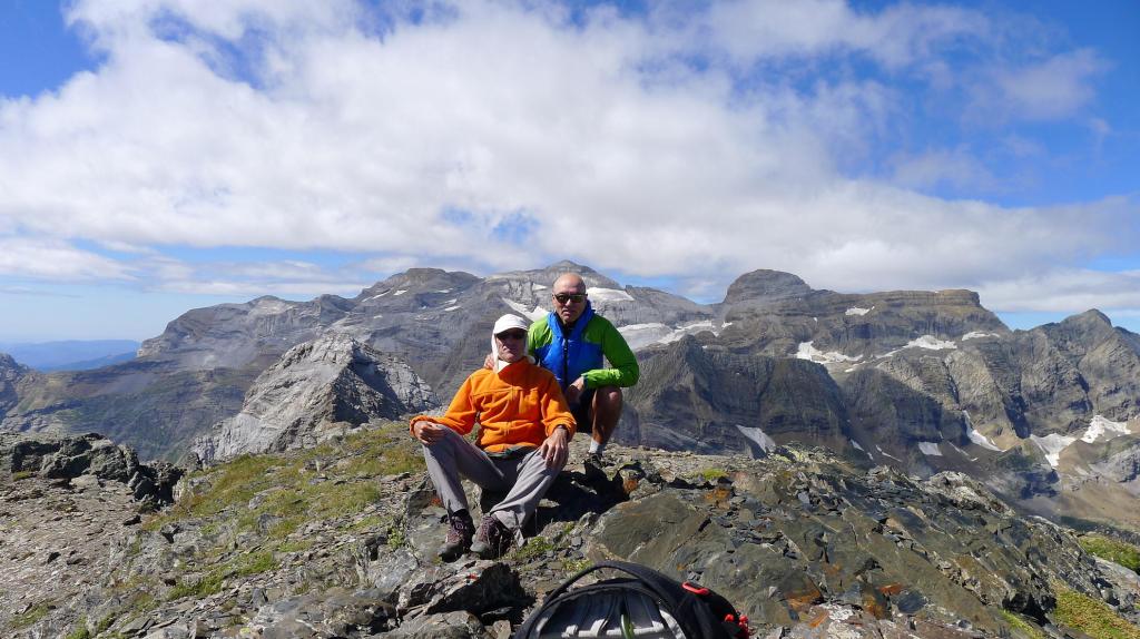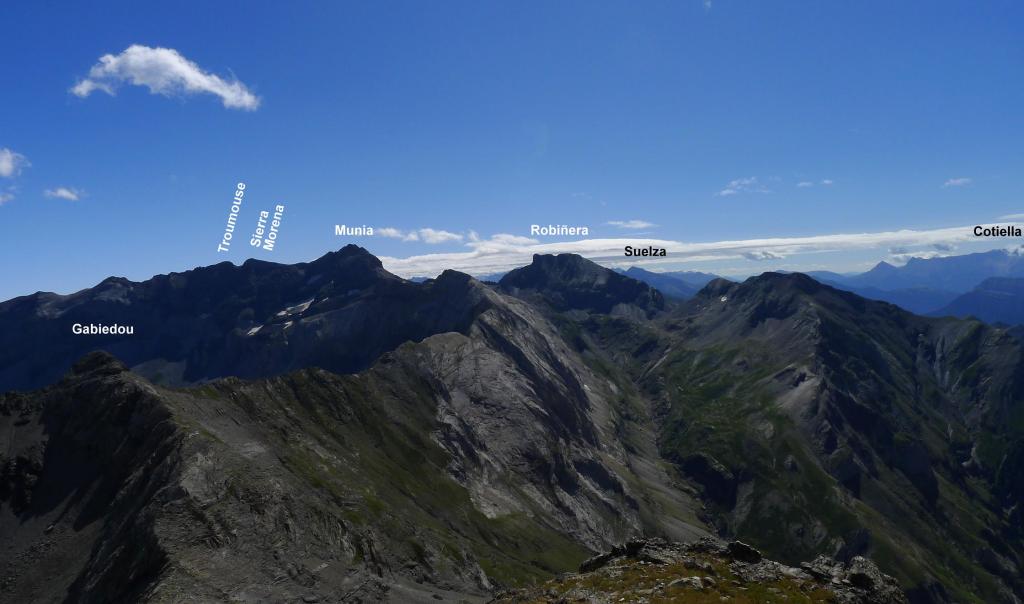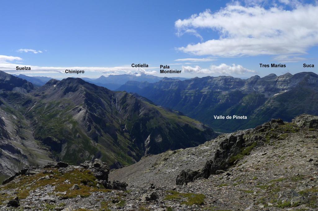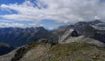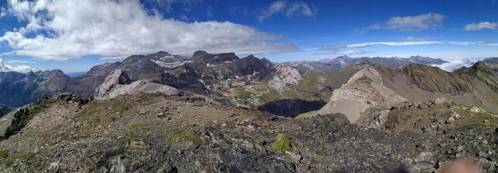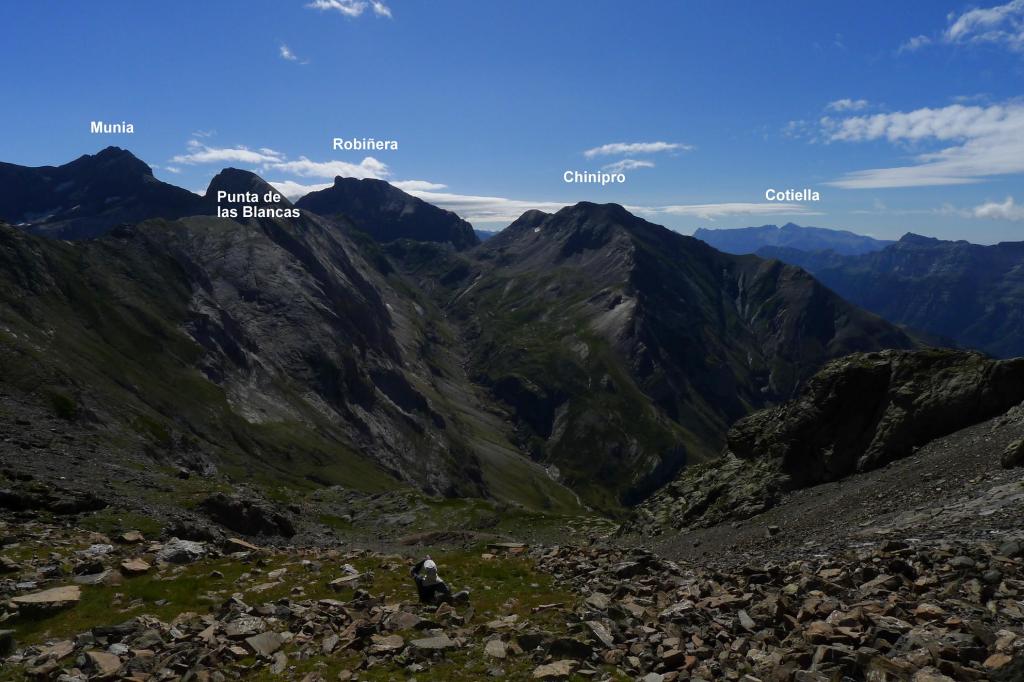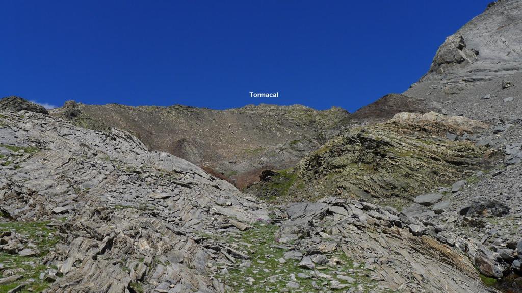 Giramos casi 360º para retomar el track en dirección W. Ascendemos por una pedrera y un barranco para tomar una vaguada pedregosa buscando algún tramo de hierba. Es difícil distinguir la cima desde abajo, puesto que solo se aprecia una cresta. Finalmente dejamos la vaguada y nos metemos en la ladera de piedras de nuestra izquierda hasta casi alcanzar la cresta. Yo avanzo justo un poco por debajo de la cresta y asciendo por una chimeneilla rocosa que, a la izquierda, desemboca en el lomo cimero a escasos metros de la cumbre del Tormacal (2846m 3h34′). Unas vistas impresionantes, como podéis ver en las fotos.